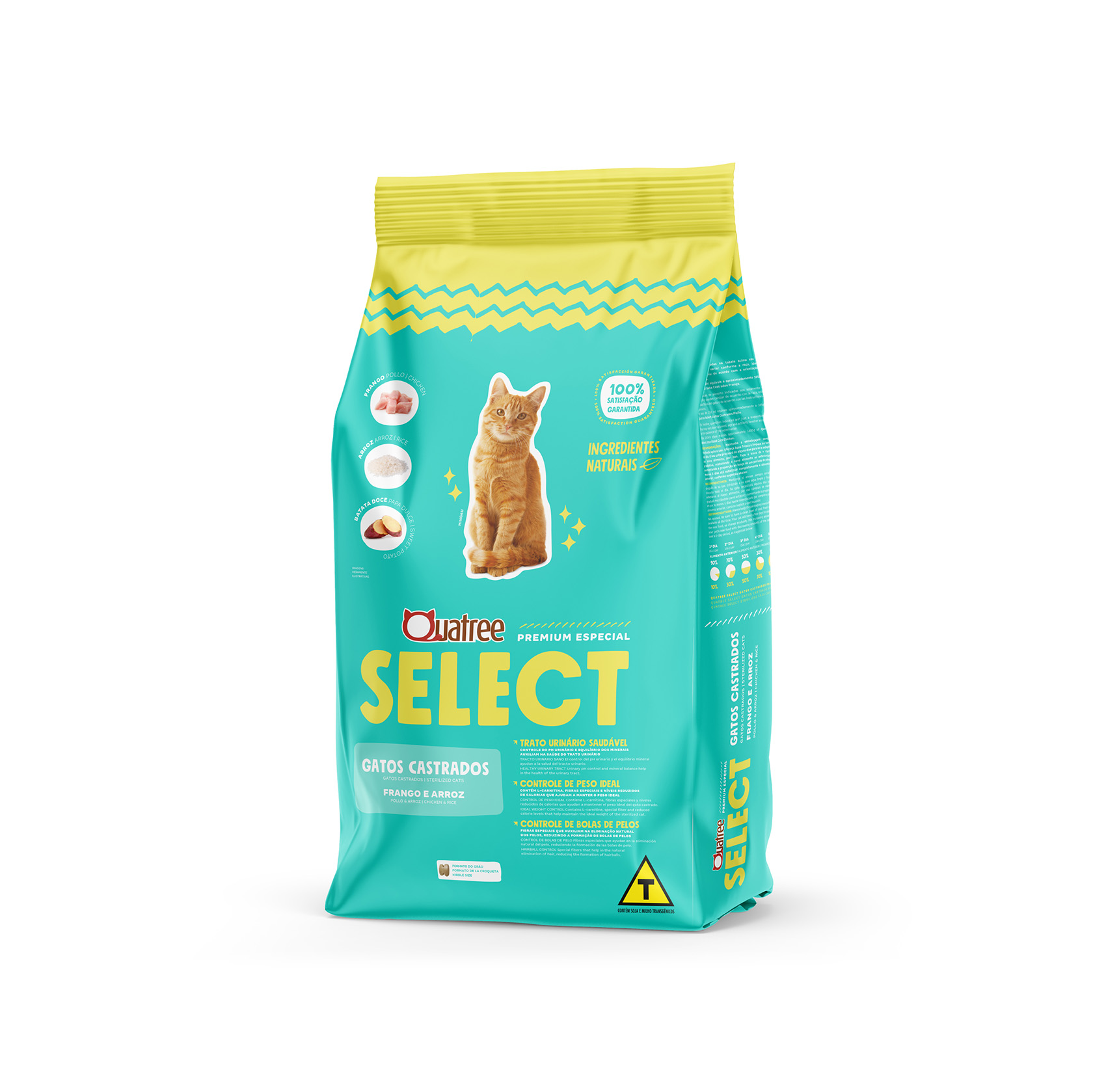 Ração Seca Quatree Select Frango Arroz Gatos Castrados auxilia no controle de peso ideal através de sua fórmula com L-carnitina, fibras especiais e redução nos níveis de calorias. É feita com ingredientes naturais, carboidratos de fácil digestão e proteínas selecionadas que garantem uma dieta rica em nutrientes e saborosa. Possui prebiótico, yucca e zeólita, componentes que reduzem o volume e odor das fezes e contribuem para o bom funcionamento intestinal. Auxilia no trato urinário saudável, com equilíbrio de minerais e controle do pH. Conta ainda com ômegas 3 e 6, essenciais para a manutenção da saúde da pele e beleza da pelagem.